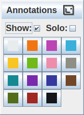 The annotations dock contains buttons representing annotation colors. Click on any one to apply it to your tool. You can click the show checkbox to toggle the visibility of annotations and you can click the solo checkbox to hide all other layers. By default, it is on the left side of the main window, in the fourth tab.