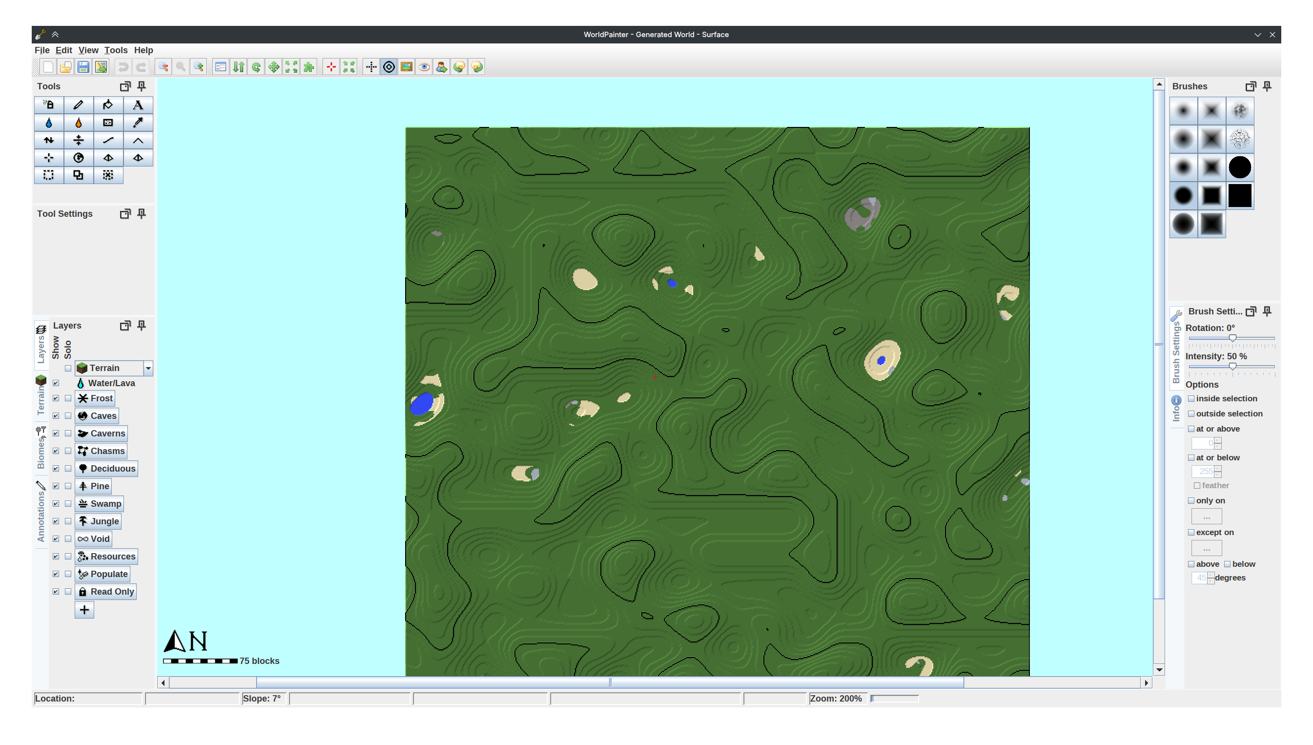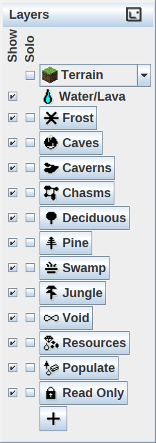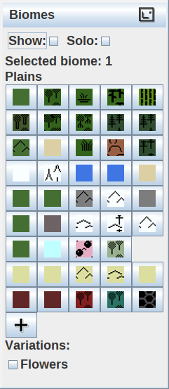 The biomes dock contains buttons representing all available biomes. Click on any one to apply it to your tool. You can click the show checkbox to toggle the visibility of biomes and you can click the solo checkbox to hide all other layers. If the selected biome has variations, you can adjust them using the checkboxes below the biome list. By default, it is on the left side of the main window, in the third tab.